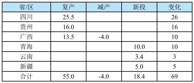 2025年復(fù)產(chǎn)產(chǎn)能55萬噸/年,主要分布在四川、貴州和廣西等省/區(qū),復(fù)產(chǎn)產(chǎn)能大部分來自2024年底由于經(jīng)營壓力過大而關(guān)停的企業(yè),還有一部分來自于技改后投放的項(xiàng)目。