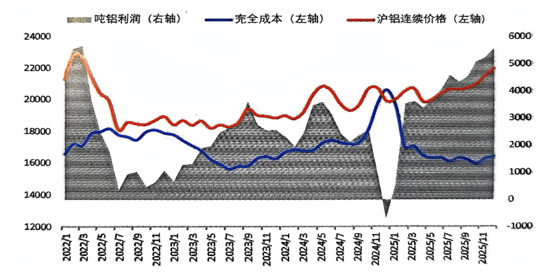 2025年,氧化鋁、電力等原材料及能源價(jià)格下跌帶動(dòng)電解鋁成本下降,同時(shí)受海外供應(yīng)擾動(dòng)、需求預(yù)期增長以及美聯(lián)儲(chǔ)降息等多重因素影響,電解鋁價(jià)格繼續(xù)上行,全行業(yè)保持較高盈利水平。尤其四季度,隨著價(jià)格重心顯著抬升,噸鋁利潤飆升至5000元以上。
